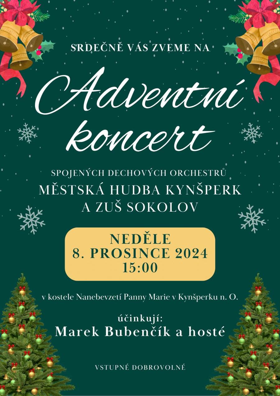 Adventní koncert spojených dechových orchestrů Městská hudba Kynšperk a ZUŠ Sokolov se uskuteční v neděli 8. 12. 2024 v 15 hodin v kostele Nanebevzetí Panny Marie v Kynšperku nad Ohří.