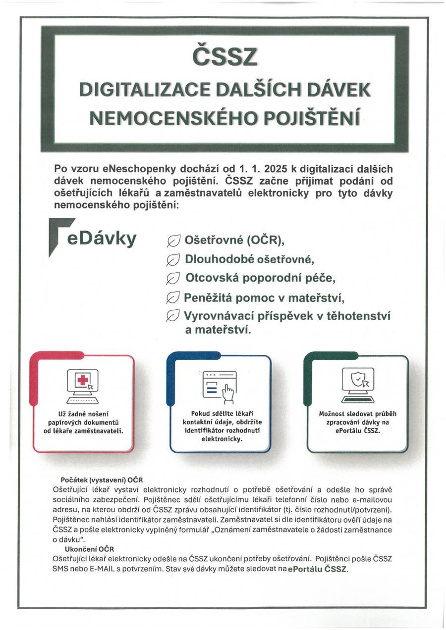 Po vzoru eNeschopenky dochází od 1. 1. 2025 k digitalizaci dalších dávek nemocenského pojištění. Bližší informace najdete v letáku níže.