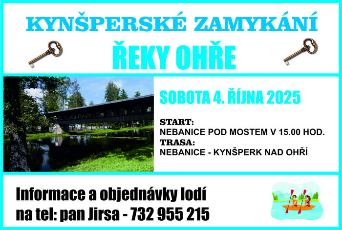 Kynšperské zamykání řeky Ohře 4. 10. 2025 v 15:00, start Nebanice pod mostem, do Kynšperka. Informace: p. Jirsa, 732 955 215.