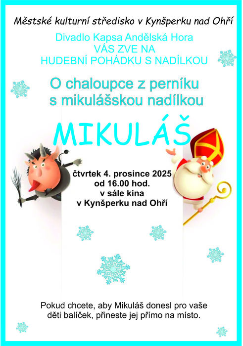 Mikuláš pro děti v sále kina Kynšperk nad Ohří 4. prosince 2025 od 16.00 hodin. Hudební pohádka s nadílkou. Balíček pro Vaše dítě přineste přímo na místo.
