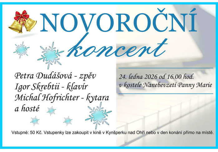 Novoroční koncert 24.01.2026 v kostele Nanebevzetí Panny Marie od 16:00. Vstupné 50 Kč, vstupenky v kině v Kynšperku nad Ohří nebo na místě.