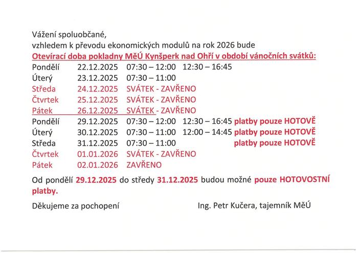 Otevírací doba pokladny MěÚ Kynšperk nad Ohří v období vánočních svátků: