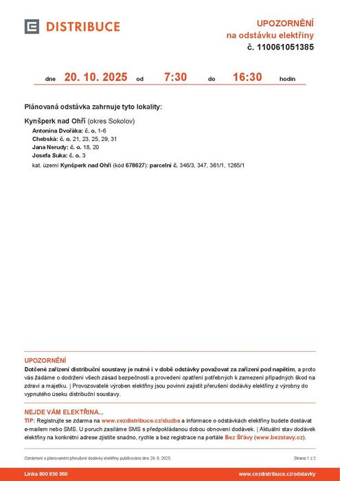 UPOZORNĚNÍ na odstávku elektřiny č. 110061051385