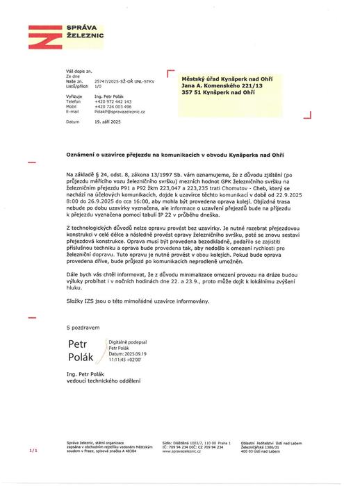 Na základě § 24, odst. 8, zákona 13/1997 Sb. vám oznamujeme, že z důvodu zjištění (po průjezdu měřícího vozu železničního svršku) mezních hodnot GPK železničního svršku na železničním přejezdu P91 a P92 žkm 223,047 a 223,235 trati Chomutov - Cheb, který se nachází na účelových komunikacích, dojde k uzavírce těchto komunikací v době od 22.9.2025 8:00 do 26.9.2025 do cca 16:00, aby mohla být provedena oprava kolejí. Objízdná trasa nebude po dobu uzavírky vyznačena, ale informace o uzavření přejezdů bude na příjezdu k přejezdu vyznačena pomocí tabulí IP 22 v průběhu dneška.
