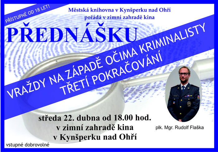 Přednáška: Vraždy na západě očima kriminalisty (22. dubna 2026 od 18:00 v zimní zahradě kina v Kynšperku nad Ohří). Vstupné dobrovolné. Přednáší Mgr. Rudolf Flaška.