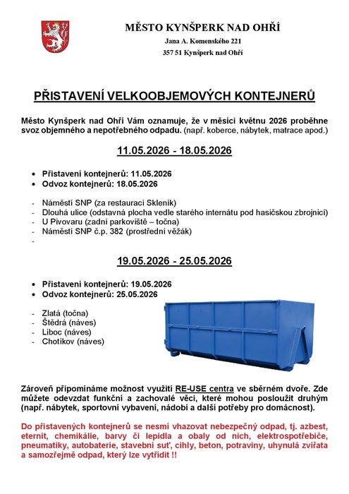 Město Kynšperk nad Ohří Vám oznamuje, že v měsíci květnu 2026 proběhne svoz objemného a nepotřebného odpadu. (např. koberce, nábytek, matrace apod.)