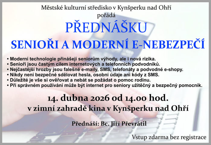 Senioři a moderní e-nebezpečí (přednáška 14. dubna 2026 od 14:00 v zimní zahradě kina v Kynšperku nad Ohří). Vstup zdarma. Přednáší Bc. Jiří Převrátil.