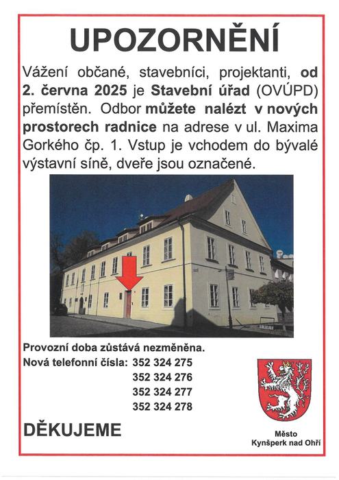 Od 2. 6. 2025 je stavební úřad přemístěn do budovy radnice Maxima Gorkého 1.