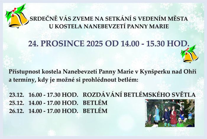 Vánoční setkání s vedením města 24.12.2025 od 14:00 - 15:30 a přístupnost betlému v kostele Nanebevzetí Panny Marie.