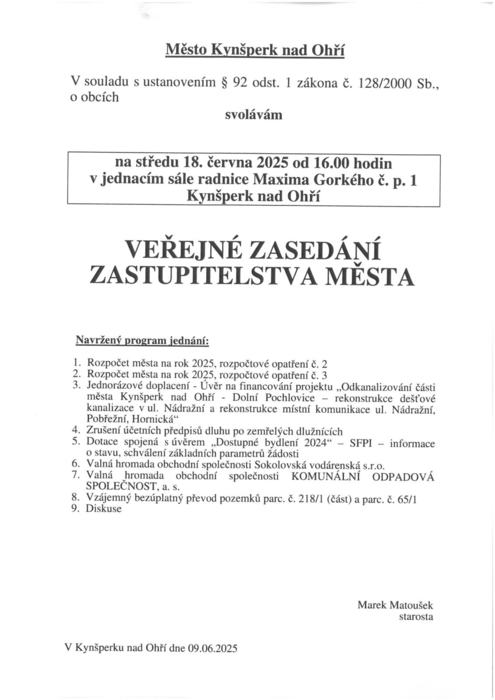 středa 18. června 2025 od 16.00 hodin, v jednacím sále radnice Maxima Gorkého č. p. 1 Kynšperk nad Ohří