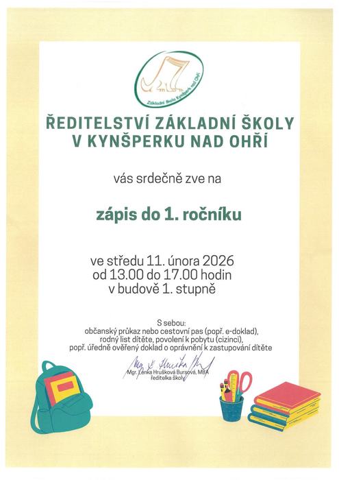 Úvod > Město > Zprávy a novinky > Zápis do 1. ročníku ZŠ Kynšperk nad Ohří- 11. února 2026
